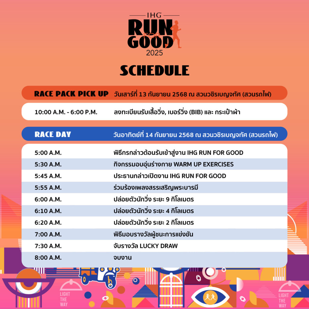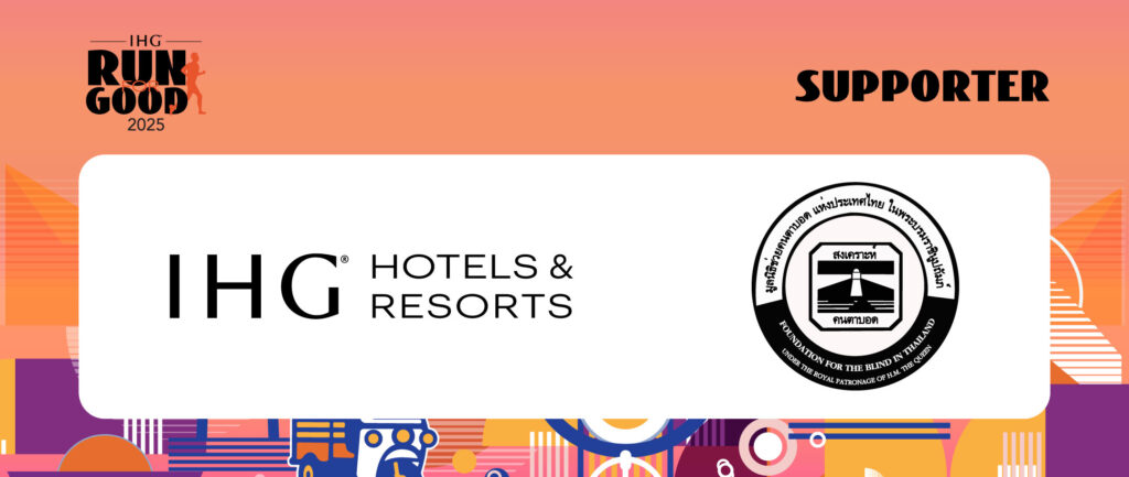 ร่วมเป็นส่วนหนึ่งของ IHG Run for Good 2025 ทุกก้าวของคุณ คือพลังแห่งการเปลี่ยนแปลง ในปีนี้ เราส่งต่อพลังแห่ง ความเห็นอกเห็นใจ การไม่ทิ้งใครไว้ข้างหลัง และการสร้างชุมชนที่แข็งแรง ผ่านแรงบันดาลใจจาก แสงสว่างและสายตา กิจกรรมครั้งนี้จัดขึ้นเพื่อสนับสนุน มูลนิธิช่วยคนตาบอดแห่งประเทศไทย ในพระบรมราชินูปถัมภ์ ชวนทุกคนร่วมกัน “ส่องทางแห่งแสงสว่าง” ให้กับผู้พิการทางการมองเห็น เพื่อเตือนใจเราว่า ถึงแม้ไม่ใช่ทุกคนที่มองเห็นโลก แต่ทุกคนคู่ควรที่จะได้รับการมองเห็น การสนับสนุน และการยอมรับ