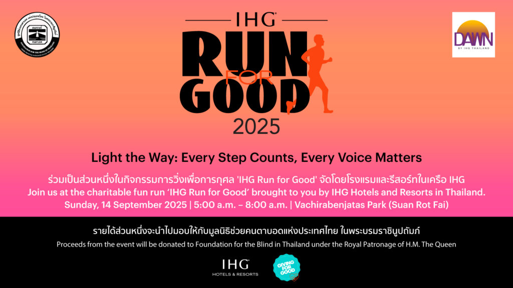 Join us for IHG Run for Good 2025 — where every step makes a difference. This year, we embrace the power of empathy, inclusion, and community empowerment through the inspiring theme of light and vision. In support of the Foundation for the Blind in Thailand under the Royal Patronage of Her Majesty the Queen, this event invites everyone to “light the path” for those without sight — a powerful reminder that while not everyone can see the world, everyone deserves to be seen, supported, and included.